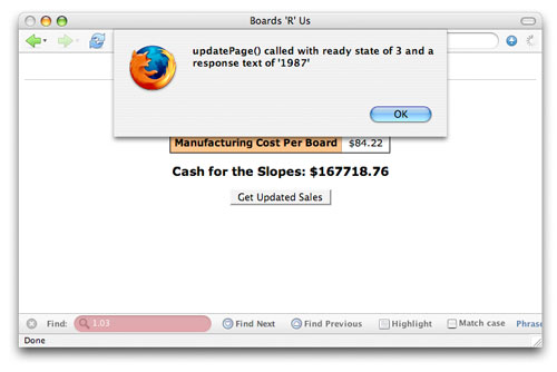 在這個(gè)簡(jiǎn)單的例子中,getSalesData() 是 Web 頁(yè)面調(diào)用來(lái)啟動(dòng)請(qǐng)求(例如點(diǎn)擊一個(gè)按鈕時(shí))所使用的函數(shù)。注意您必須在調(diào)用 open()之前 來(lái)查看就緒狀態(tài)。圖 1 給出了運(yùn)行這個(gè)應(yīng)用程序的結(jié)果。