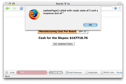 這段代碼就是 onreadystatechange 意義的一個(gè)確切展示 —— 每次請(qǐng)求的就緒狀態(tài)發(fā)生變化時(shí),就調(diào)用 updatePage(),然后我們就可以看到一個(gè)警告了。圖 2 給出了一個(gè)調(diào)用這個(gè)函數(shù)的例子,其中就緒狀態(tài)為 1。