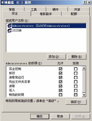 2.系統(tǒng)盤和站點(diǎn)放置盤除administrators 和system的用戶權(quán)限全部去除.