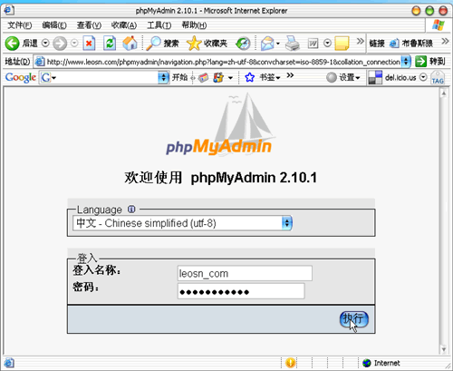 打開phpMyAdmin所在服務(wù)器目錄,比如http://www.leosn.com/phpmyadmin/ ,繼續(xù)輸入MySQL用戶的用戶名和密碼,進(jìn)入。