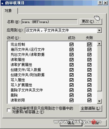 上面提到了,我們要對每個用戶訪問文件夾的操作進(jìn)行跟蹤并形成日志,要實現(xiàn)這個功能就要給abc文件夾添加審核。打開abc文件夾的屬性,然后打開“安全”標(biāo)簽,點“高級”按鈕,在“審核”標(biāo)簽里給這個文件夾設(shè)置審核,如圖9。點“添加”按鈕,在"選擇用戶和組"對話框里填入“wawa”組,如圖10,確定后把完全控制的成功和失敗都設(shè)置為審核項目,如圖11。