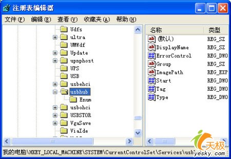用鼠標(biāo)逐一單擊其中的HKEY_LOCAL_MACHINE\System\CurrentControlSet\Services\USBHUB注冊(cè)表子鍵(如圖2所示),在對(duì)應(yīng)“USBHUB”項(xiàng)目的右側(cè)顯示區(qū)域中,檢查一下是否存在名為“DisableSelectiveSuspend”的鍵值,要是還沒(méi)有的話,可以用鼠標(biāo)右鍵單擊空白位置,并從其后打開(kāi)的右鍵菜單中依次單擊“新建”/“Dword值”命令,然后將新建的雙字節(jié)值名稱設(shè)置為“DisableSelectiveSuspend”,再用鼠標(biāo)雙擊該鍵值,最后在對(duì)應(yīng)的數(shù)值設(shè)置框中輸入“1”,并單擊一下“確定”,再將計(jì)算機(jī)系統(tǒng)重啟一下,這樣的話移動(dòng)硬盤(pán)即使與其他USB設(shè)備同處一個(gè)USB集線器,也不會(huì)受到其他設(shè)備的插拔干擾了。