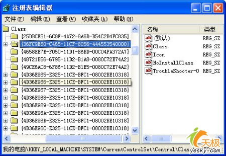 其次將鼠標(biāo)定位于HKEY_LOCAL_MACHINE\SYSTEM\CurrentControlSet\Control\Class\{36FC9E60-C465-11CF-8056-444553540000}注冊(cè)表分支,如圖1所示;