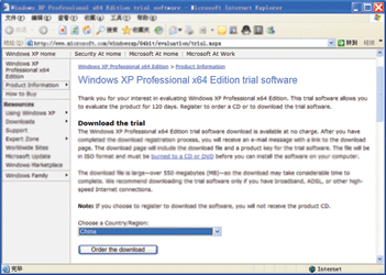 微軟提供下載的Windows XP x64可以免費使用180天,這已經(jīng)足夠體驗64位操作系統(tǒng)的風(fēng)采了。訪問http://www.microsoft.com/windowsxp/64bit/evaluation/trial.mspx頁面,選擇所在的國家或地區(qū)China,然后單擊下面的Order the download按鈕,根據(jù)提示提供姓名、詳細(xì)地址、郵政編碼、地區(qū)、郵箱等用戶信息,為了保證及時收到通知郵件,最好提供Hotmail或雅虎等國外郵箱,提交后在一般情況下,1天之內(nèi)即可收到通知郵件,其中包括下載地址、試用序列號,按照提示下載即可,文件名為WS03SP1_RTM_1830_PX6_EN.iso。假如你希望獲取光盤,那么需要付郵寄費,中國用戶是20美元,如圖1。