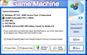 常聽別人說玩電腦游戲最好的操作系統(tǒng)是Win98,原因無非是Win98操作系統(tǒng)占用系統(tǒng)資源非常少,而WinXP雖然功能特別強大,但系統(tǒng)資源占用也直線狂飆,而對于我們魔獸玩家來說,WinXP的許多強大功能我們是不需要的,可以考慮暫時移除這些“額外”功能。這里推薦使用Game Machine這款自動把計算機系統(tǒng)變?yōu)橛螒驒C的軟件(下載地址:http://www.onlinedown.net/soft/25191.htm),它的使用方法非常簡單,只需要按下“Warp Speed”就可以了(圖4)。