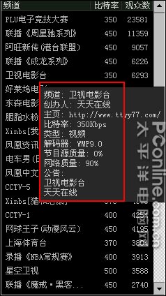 軟件內(nèi)置的頻道及電視節(jié)目相對比較少,所以也就沒有分類了。從軟件收錄的頻道及電視節(jié)目看,精品的確不少,像CCTV各頻道、鳳凰中文、好萊塢電影臺、東森電影臺、法國時尚臺、湖南衛(wèi)視和重慶經(jīng)濟電臺等均有收錄。軟件還有一個比較有特色的地方是對每一個頻道都有十分詳細的注釋,用戶將鼠標移動到一個頻道上停留片刻,就可以看到關于該頻道的創(chuàng)辦人、主頁、比特率、所使用的視頻解碼器、節(jié)目源質(zhì)量、網(wǎng)絡質(zhì)量和頻道公告等注釋信息了(如圖10)。