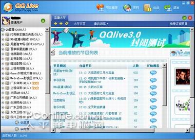 和上面的幾款軟件相比,這款軟件的界面算是十分“豪華”的了,軟件將頻道及電視節(jié)目列表安排在了界面的左側(cè)并按照“QQ直播”和“QQ電臺”進行了歸類(如圖5)。