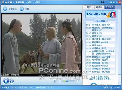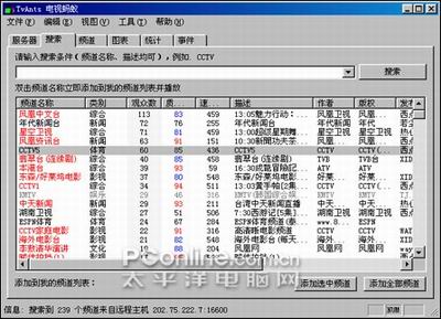 軟件收錄了239個頻道及電視節(jié)目,盡管看上去比較龐雜,但其中的李敖在清華/復旦演講、十面埋伏、李連杰專輯、佐羅傳奇、NBA常規(guī)賽和NBA季前賽等都是不可多得的精品節(jié)目(如圖15)。