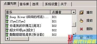 小馬只要在自己電腦屏幕上的服務(wù)端窗口中,進(jìn)入“點(diǎn)播列表”便可以查看到各位兄弟所點(diǎn)播的歌曲,以及是哪位兄弟點(diǎn)播的歌曲等信息(顯示點(diǎn)播機(jī)的機(jī)器名),這些歌曲會(huì)自動(dòng)依次序播放;如果想讓某個(gè)兄弟點(diǎn)播的歌曲提前播放,小馬只要選中該歌曲,然后點(diǎn)擊“提前”按鈕,便可以將其放到播放列表的最前端,如果選中歌曲并點(diǎn)擊“播放”(圖5),則立即播放所選歌曲而不按點(diǎn)播順序。誰先誰后,小馬有絕對(duì)的控制權(quán),儼然是一個(gè)電臺(tái)主播。^_^