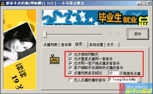 啟動(dòng)服務(wù)端主程序ActiveServ.exe,在主窗口切換到“選項(xiàng)”下,勾選“允許局域網(wǎng)聊天”這樣好讓兄弟們?cè)邳c(diǎn)歌時(shí)能夠輸入文字聊天;因?yàn)橛行值芟矚g聽相同的歌曲,讓為了讓他們獨(dú)自能點(diǎn)播相同歌曲,選中“允許重復(fù)點(diǎn)播同一首音樂”;在“點(diǎn)播列表?xiàng)l目超過”后輸入數(shù)字,這樣當(dāng)點(diǎn)播曲目達(dá)到相應(yīng)數(shù)量時(shí)不再接受點(diǎn)播(圖1)。