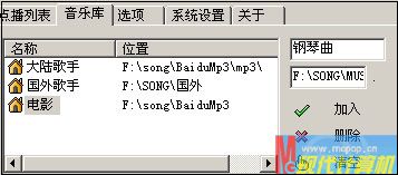 為了方便不同的兄弟點(diǎn)播不同類型的歌曲,小馬切換到“音樂庫(kù)”選項(xiàng)下,加入了“大陸歌手”和“國(guó)外景點(diǎn)音樂”兩種類型,方法如下:在右側(cè)上方的文本框中輸入文字標(biāo)識(shí),在下方的文本框中輸入歌曲所在路徑,然后點(diǎn)擊 “加入”(圖3)。仿上還可以加入更多類別。