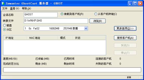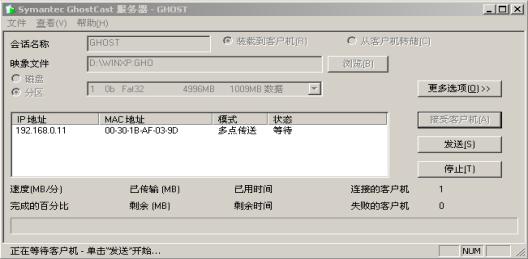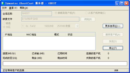 好了,現(xiàn)在你的客戶端已經(jīng)進入接收狀態(tài)了.在去GHOST服務器看看把,看你是不是在服務器已經(jīng)看到了別的機器的IP和MAC地址了呢.