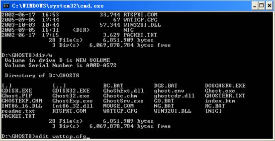 在GHOST.EXE所在的目錄里輸入 edit空格wattcp.cfg