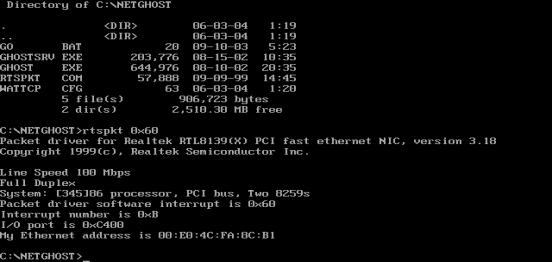 好了,之后驅(qū)動網(wǎng)卡.我的網(wǎng)卡是RTL8139,執(zhí)行DOS驅(qū)動,RTSPKT空格0X60 , 0X60是給網(wǎng)卡的一個中斷,這里必須給網(wǎng)卡一個中斷,否則你也驅(qū)動不起你的網(wǎng)卡.我用的中斷是0X60.