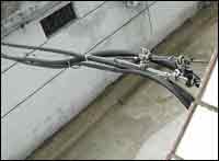 在布線方面,徐主任給自己的機房采取的是下走線的方式。光纖從室外進(jìn)入室內(nèi),如圖1所示(入戶的線纜包括光纖和電話線),光纖直接通過架空的地板走線。然后通過尾纖、光纖收發(fā)器、超5類雙鉸線,與交換機相連,如圖2所示。