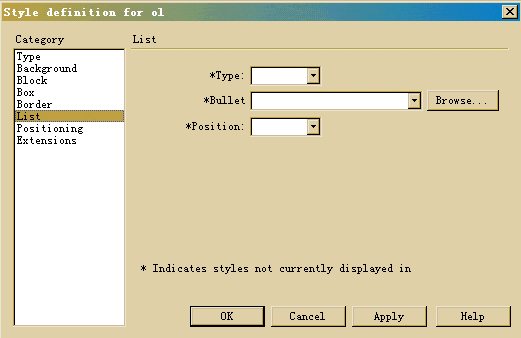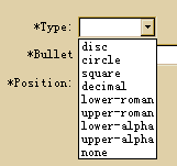 在“Style Definition for ol”對(duì)話框左邊的選擇窗口中選擇“l(fā)ist”,在右邊的面板上我們只要定義“Type”就行了,點(diǎn)一下右邊那個(gè)三角形按鈕,可看到如下圖所示的列表: