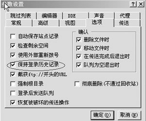 我們知道,訪問FTP服務一般有兩種方法,可以通過瀏覽器直接訪問或通過客戶端FTP軟件實現。這兩種方法都會給安全帶來隱患。主要是因為原始登錄信息保存在瀏覽器或者FTP軟件里,當下一位操作者使用瀏覽器或者FTP軟件時,就很容易進入剛剛使用過這些軟件的用戶空間。其實,這個問題解決起來也比較容易。如果采用IE直接訪問,我們只要通過IE的Internet選項中的“清除歷史記錄”就可解決;如果是通過FTP軟件訪問,一般的FTP軟件在系統(tǒng)參數定義中就有一項去除登錄歷史記錄的選項。下面以LeapFTP為例,方法是:啟動LeapFTP,點擊菜單欄中的“選項”菜單,選擇“參數設置”中的“常規(guī)”命令,出現“常規(guī)”設置對話框,再選擇其中的“選項”標簽,進入常規(guī)屬性設置(請見圖1),這里有“保持登錄歷史記錄”一項,我們只要把它前面的復選框中的勾去掉即可。