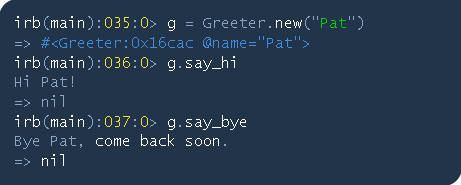 在上面的類代碼中定義了一個(gè)稱為Greeter的類和一些類方法,其中出現(xiàn)了一些新的“關(guān)鍵詞”:請注意“@name”,它是類的實(shí)例變量,并對類中的所有方法(say_hi和say_bye方法)都有效。