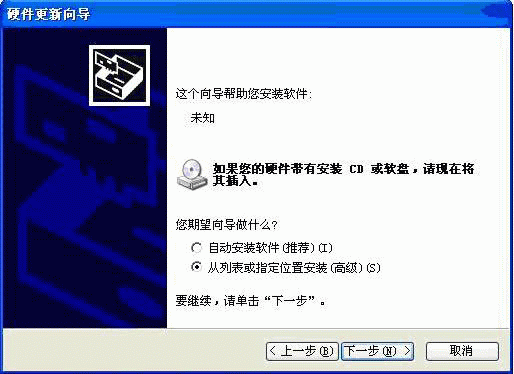 •  選擇上圖中的 從列表或指定位置安裝 ( 高級(jí) )(S) ,點(diǎn)擊下一步:
