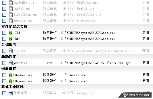 c)再看全面檢測,這里省略了很多映像劫持的項目,以使截圖清晰,在隱藏了已知的安全項后,可以發(fā)現(xiàn)病毒修改了文件關(guān)聯(lián),添加了一個驅(qū)動程序。
