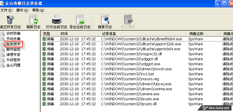 g)重啟后,報(bào)告搶殺了病毒若干,這個(gè)窗口我一時(shí)大意,沒(méi)截下來(lái),看日志吧。都是這個(gè)瓢蟲(chóng)下載下來(lái)的spyware。