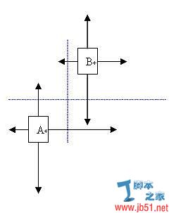 首先,設兩個圖塊A,B,那么每個圖塊都有X向和Y向兩條射線,那么如果存在一條Y向法線在AB的X射線公共區(qū)之間,或者存在X向法線在AB的Y射線公共區(qū)之間,那么就找到了一條路徑。