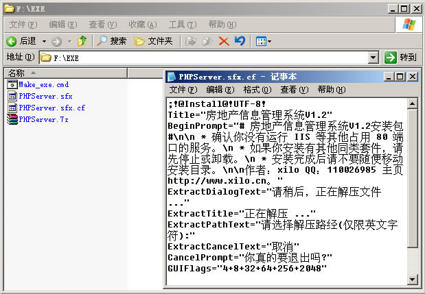 第三,向這些綠色集成套件一般里面都有寫好的BAT也就是批處理文件,直接啟動(dòng)輸入號(hào)碼就能啟動(dòng)和關(guān)閉服務(wù)。這時(shí)我們可以用RAR自解壓+運(yùn)行批處理,可以,但現(xiàn)在遭到很多殺毒軟件封殺攔截。其實(shí)我用的也是這個(gè)原理。我在網(wǎng)上找到了一個(gè)打包程序make_exe(來自PHPnow)可以把.7z+打包后的文件界面信息打成一個(gè)EXE運(yùn)行包,并在運(yùn)行自解壓后自動(dòng)運(yùn)行7z壓縮包中的批處理文件。make_exe.zip包里有Make_exe.cmd,PHPServer.sfx,PHPServer.sfx.cf三個(gè)文件??吹竭@一點(diǎn),大家應(yīng)該有思路了吧。首先把PHPServer壓成PHPServer.7z文件然后配置好。修改PHPServer.sfx.cf文件,然后運(yùn)行Make_exe.cmd就可以了。