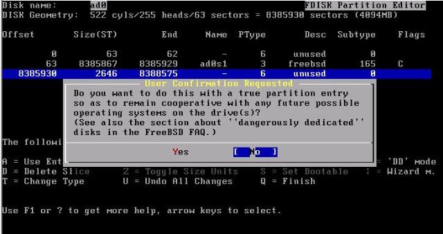 為了保證與FreeBSD共存的系統(tǒng)能夠啟動,默認情況下FreeBSD會保留一部分磁盤空間(64cyl)。我們裝的是單系統(tǒng),這部分空間沒