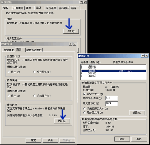 右鍵“我的電腦”選擇屬性-高級-性能設置-高級-更改;先選擇C盤,勾中“無分頁文件”選項,然后選擇其它分區(qū),勾選“自定義大小”。如果你是1G內(nèi)存的話,設為512~1024就足夠了;然后點擊設置。如下圖