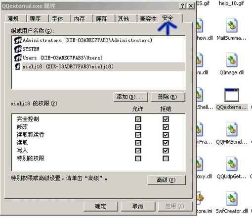 接著裝QQ吧。大部分人不喜歡QQ的迷你新聞窗口。這里提供一個(gè)小謝原創(chuàng)的方法解決這個(gè)問題,但有個(gè)前提,QQ所在分區(qū)的文件系統(tǒng)是NTSF格式的。進(jìn)入QQ安裝目錄,選擇QQexternal.exe文件,右鍵選擇屬性-安全,選中自己的用戶名,設(shè)置如圖