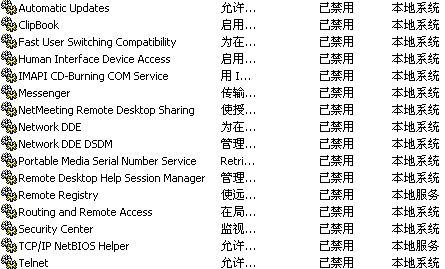 單擊“開始”→“設(shè)置”→“控制面板”。雙擊“管理工具”→“服務(wù)”,打開后將看到服務(wù)列表,有些服務(wù)已經(jīng)啟動(dòng),有些則沒有。右鍵單擊要配置的服務(wù),然后單擊“屬性”。在“常規(guī)”選項(xiàng)卡上選擇“自動(dòng)”、“手動(dòng)”或“禁用”,其中“自動(dòng)”表示每次系統(tǒng)啟動(dòng)時(shí),WindowsXP都自動(dòng)啟動(dòng)該服務(wù);“手動(dòng)”表示W(wǎng)indowsXP不會(huì)自動(dòng)啟動(dòng)該服務(wù),而是在你需要該服務(wù)時(shí)手動(dòng)啟動(dòng)該服務(wù);而“禁用”則表示不允許啟動(dòng)該服務(wù)。在實(shí)際配置時(shí),選擇“手動(dòng)”或者“禁用”都可以實(shí)現(xiàn)關(guān)閉該服務(wù)的目的,推薦使用手動(dòng)功能,這樣你隨時(shí)可以啟動(dòng)一些臨時(shí)需要的服務(wù)。有些服務(wù)是WindowsXP所必需的,不能關(guān)閉,否則將會(huì)造成系統(tǒng)崩潰。至于各項(xiàng)服務(wù)的功能,我們可以通過雙擊該服務(wù)或?qū)⑹髽?biāo)懸停在該服務(wù)名上查看。具體服務(wù)的說明淺顯,大家看得懂,可以自己選擇那些要那些不要。修改的方法是:選中禁用的服務(wù),點(diǎn)右鍵,選"屬性">"停止",將"啟動(dòng)類型"設(shè)置為"手動(dòng)"或"已禁用"。