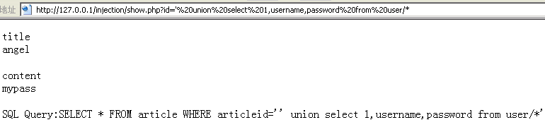 http://127.0.0.1/injection/user.php?username=angel' and password='mypass |