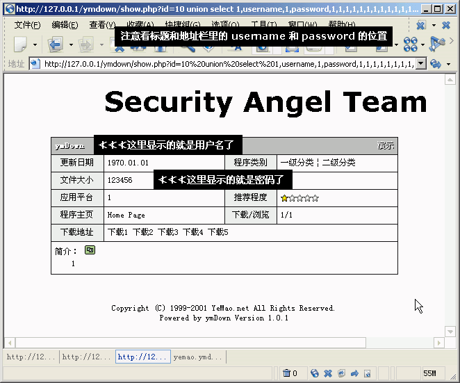 用戶名和密碼的數(shù)據(jù)類型都是varchar,所以我們要選擇ymdown表里數(shù)據(jù)類型是varchar來,如果把varchar的數(shù)據(jù)寫到int的地方當(dāng)然是不可能顯示的了,由于updatetime(更新日期)的長度是20,可能會出現(xiàn)顯示不完全的情況,我們就把用戶名顯示在name(軟件標(biāo)題)那里,密碼顯示在size(文件大?。┠抢锖昧耍?9個(gè)“1”中,name和size分別是第二個(gè)和第四個(gè),我們提交: