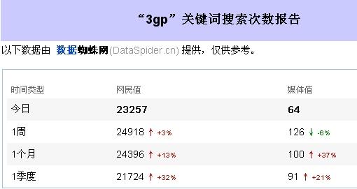實踐:為手機用戶提供視頻下載的網(wǎng)站,自以為找到“手機視頻”、“手機電影”就非常完美了,其實手機用戶日搜索“3GP”為23257次,遠遠高于“手機視頻”、“手機電影”的1381次、3829次。
