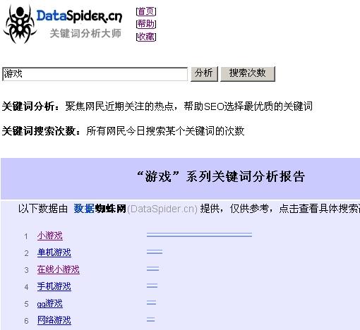 實踐:如果您想開發(fā)一個游戲相關(guān)的網(wǎng)站,但又不知道目前網(wǎng)友喜歡玩哪些游戲。是網(wǎng)絡(luò)游戲熱門,還是Flash游戲熱門呢?“關(guān)鍵字分析大師”查詢“游戲”,排在第一位的是“小游戲”,因此得知,網(wǎng)友搜索頻率最高的是“小游戲”這三個字。