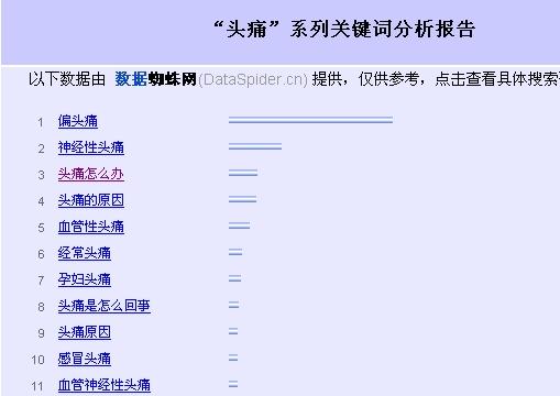 實踐:醫(yī)院網(wǎng)站如果只選擇“醫(yī)院”這個關(guān)鍵詞進行優(yōu)化的話,那就是撿了芝麻丟西瓜。網(wǎng)友搜索較多的是大型醫(yī)院,百度收錄排名較前的也是大型網(wǎng)站,如果您一定要挑“醫(yī)院”和他們拼的話,根本就得不償失!建議采用信息化策略,挑選患者關(guān)心的疾病詞匯進行優(yōu)化并組織文章,如圖:不選擇熱門的“頭痛”、“偏頭痛”,而選擇“頭痛怎么辦”、“頭痛原因”、“頭痛吃什么藥”等,這些競爭力較小,轉(zhuǎn)換率較高,訪客很有可能直接成為醫(yī)院的客戶。