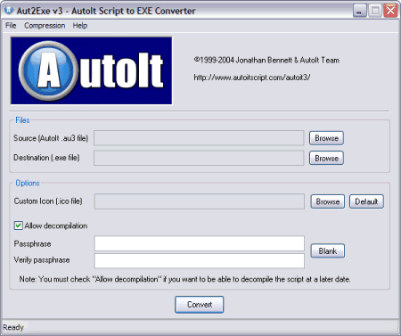 Aut2exe.exe /in <infile.au3> [/out <outfile.exe>] [/icon <iconfile.ico>] [/nodecompile] [/comp 0-4] [/pass <passphrase>]