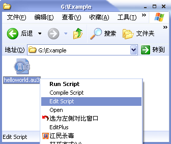 我們已經(jīng)創(chuàng)建了腳本文件了,現(xiàn)在要做的就是對此腳本進行編輯使其具有我們需要的功能。在helloworld.au3這個腳本文件上點擊鼠標右鍵然后在菜單中選擇Edit Script。