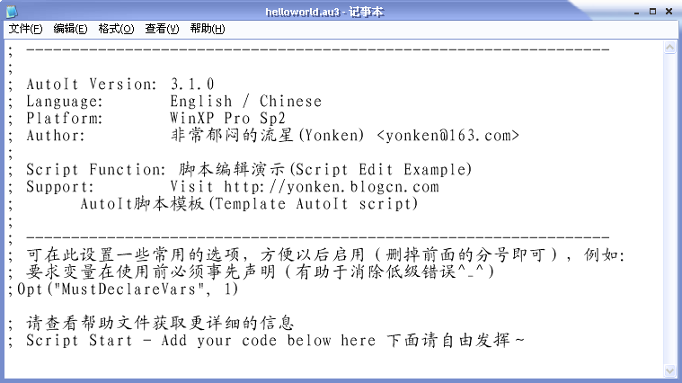 保存腳本并關閉記事本?,F(xiàn)在您已經(jīng)寫出了您自己的第一個AutoIt腳本了!要運行這個腳本只需簡單地雙擊helloworld.au3文件即可(也可以使用右鍵點擊該腳本然后在菜單中選擇 Run Script)。