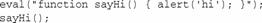 這里,函數(shù)sayHi()是在eval()調(diào)用內(nèi)部定義的。因為該調(diào)用將被替換為真正的函數(shù),所以仍可在接下來的一行中調(diào)用sayHi()。