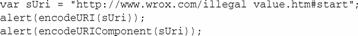 在這個例子中,變量uri存放的是用encodeURIComponent()編碼的字符串。生成的值說明了應(yīng)用兩個解碼方法時會發(fā)生的事情。第一個值由decodeURI()輸出,把%20替換成空格。第二個值由decodeURIComponent()輸出,替換所有的特殊。