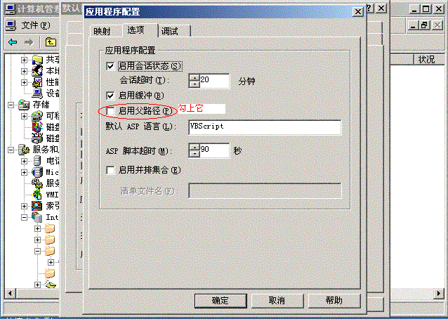 除些以外沒有任何其它有價值的信息,因為此網(wǎng)站在我的電腦上執(zhí)行是正常的,猜想應(yīng)該是IIS配置上的問題(早就聽說IIS的安全性提高了,是否是有做過限制),但我的代碼都是非常標(biāo)準(zhǔn)的ASP代碼呀,沒有用過任何第三方插件。但在IIS的屬性中查看良久,相關(guān)的選項都選擇過了,都沒有反應(yīng),仍然就是上面這個頁面。正在首頁上亂點亂點時,突然跳出另一個畫面來,大意是說“沒有訪問父路徑的權(quán)限”。奇怪了,為何會有這個錯誤,這在IIS 5.0上是默認(rèn)的呀,難道在IIS 6.0上已經(jīng)取消了么?重新打開IIS屬性項,選擇“主目錄”,點擊上面的“配置”按鈕,在彈出的窗口上選擇“選項”標(biāo)簽,發(fā)現(xiàn)果然沒有勾上,如下圖: