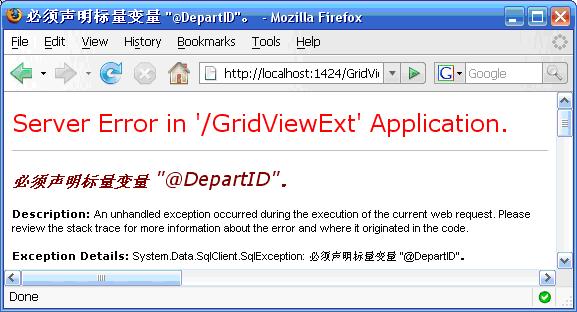 圖4 未指定GridView的DataKeyNames導(dǎo)致的錯誤提示 四、觀察運行結(jié)果