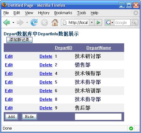 另外,請注意在第一列的<FooterTemplate>中我們添加了Add和Hide兩個按鈕,它們的事件代碼如下: