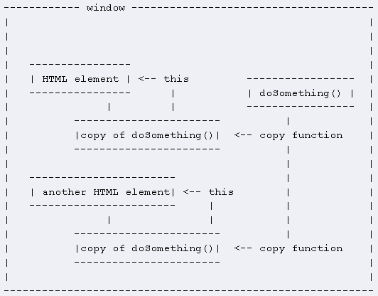 這樣你就可以最大限度使用this。每當(dāng)執(zhí)行該函數(shù),this所指向的HTML元素都正確響應(yīng)事件,這些HTML元素?fù)碛衐oSomething()的一個拷貝。