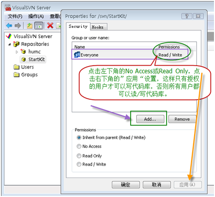 點(diǎn)擊"確定"按鈕,上面的用戶就具有了訪問StartKit代碼庫的不同權(quán)限。