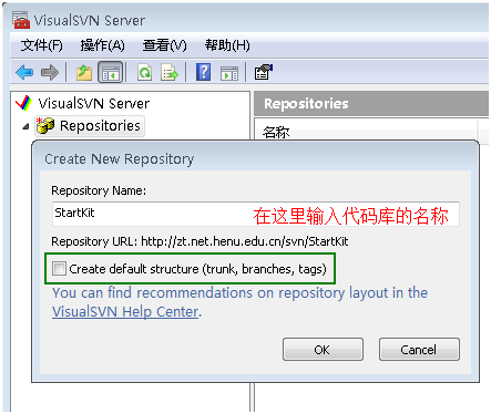 注意:上圖中的CheckBox如果選中,則在代碼庫StartKit下面會(huì)創(chuàng)建trunk、branches、tags三個(gè)子目錄;不選中,則只創(chuàng)建空的代碼庫StartKit。