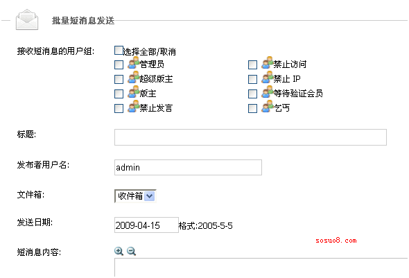 執(zhí)行方法也是讓我感到奇怪,居然是:比如我選擇了乞丐,而乞丐這個等級有10萬用戶,則取得這10W用戶的數(shù)據(jù),一條條執(zhí)行插入。暴汗……這樣算法以及實現(xiàn)確實簡單了很多,但會員一多,要經常清理這些數(shù)據(jù)。這也是為什么我們看到discuz的論壇經常一段時間需要清理短消息的原因。建議批量發(fā)送只對等級較高,數(shù)量較少的用戶使用。同時在使用過程中,不明白為什么在“批量短消息發(fā)送”中的“文件箱”有“收件箱”、“發(fā)件箱”、“草稿箱”3種,這里應該只有“收件箱”比較合適,或者這里根本就不該出現(xiàn)這個“文件箱”。