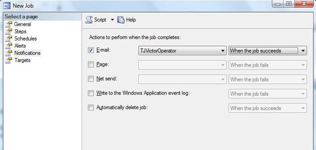 3.建立一個(gè)新Job->在通知(Notifications)中,選擇Email和剛才新建的Operator->選擇當(dāng)Job失敗/成功/完成時(shí)